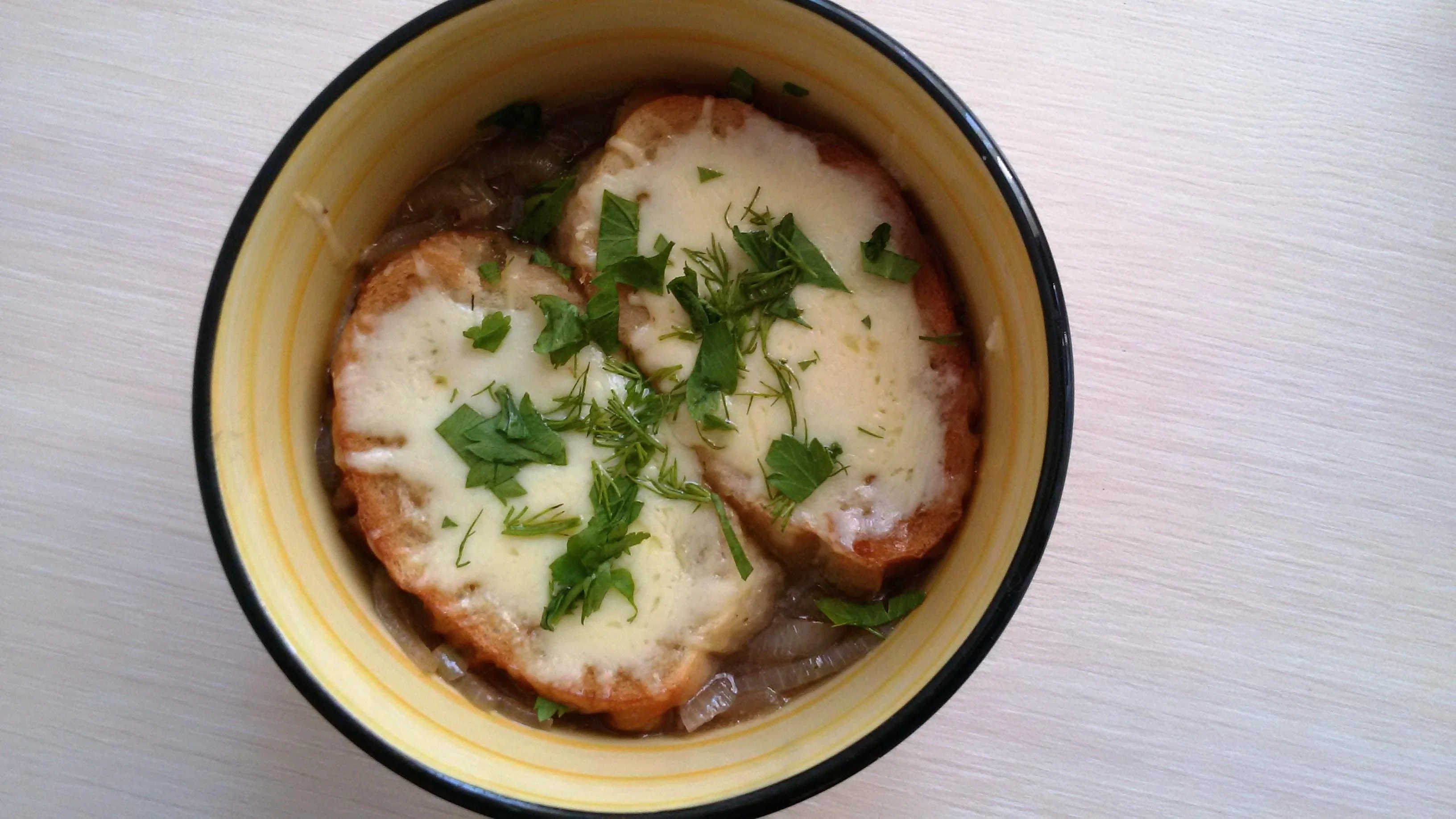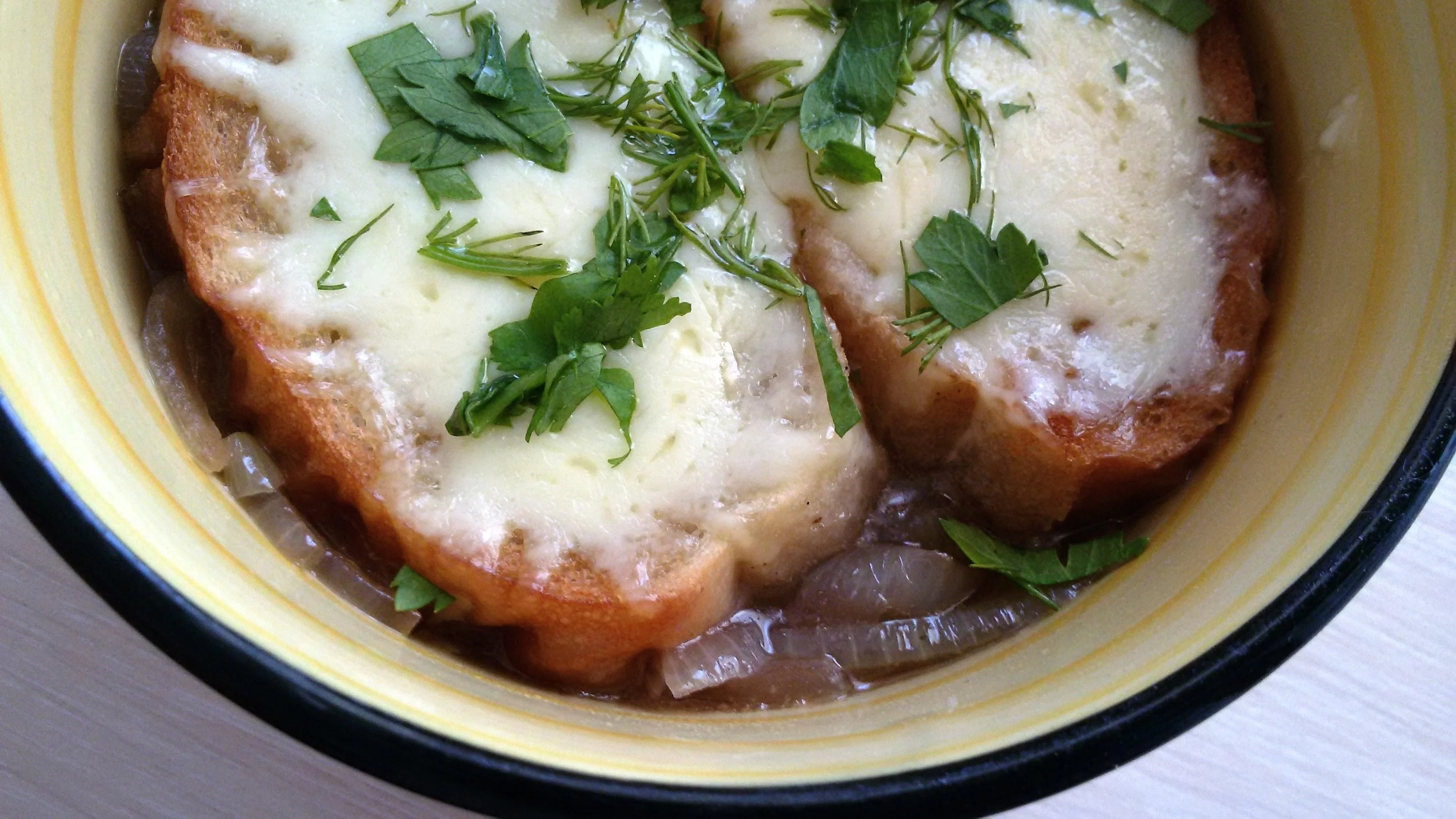 ШАГ 1 4 большие желтые луковицы (примерно по 250–300 грамм каждая) нарезать кольцами, полбагета французского белого хлеба — тонкими ломтиками, как на тосты.