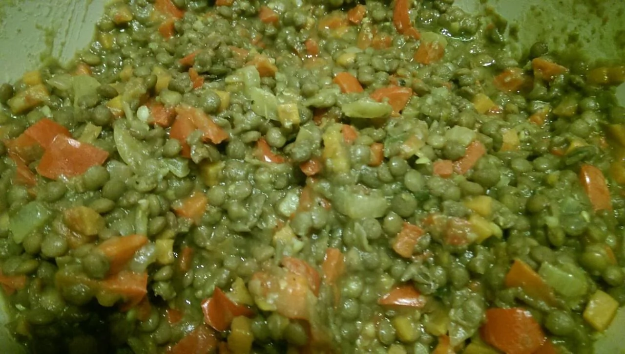 ШАГ 3 Разогреть в сковороде ложку оливкового масла и пожарить на нем сладкий перец. Через пять минут добавить специи и жарить, помешивая, еще минуту. Тогда добавить остальные овощи и еще три ложки масла и жарить еще восемь минут. Вмешать овощи в чечевицу.