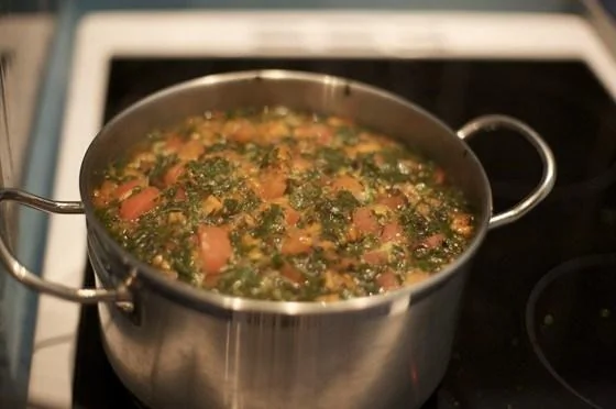 ШАГ 3 В кастрюле разогреть оливковое масло (так, чтобы на пару мм покрывало дно), немного обжарить лук с чесноком, добавить петрушку, обжаривать 2–3 минуты, помешивая. Затем добавить помидоры, подержать пару минут на сильном огне, потом добавить полстакана воды или овощной бульон, снизить огонь, накрыть крышкой и оставить тушиться минут на 15–20.