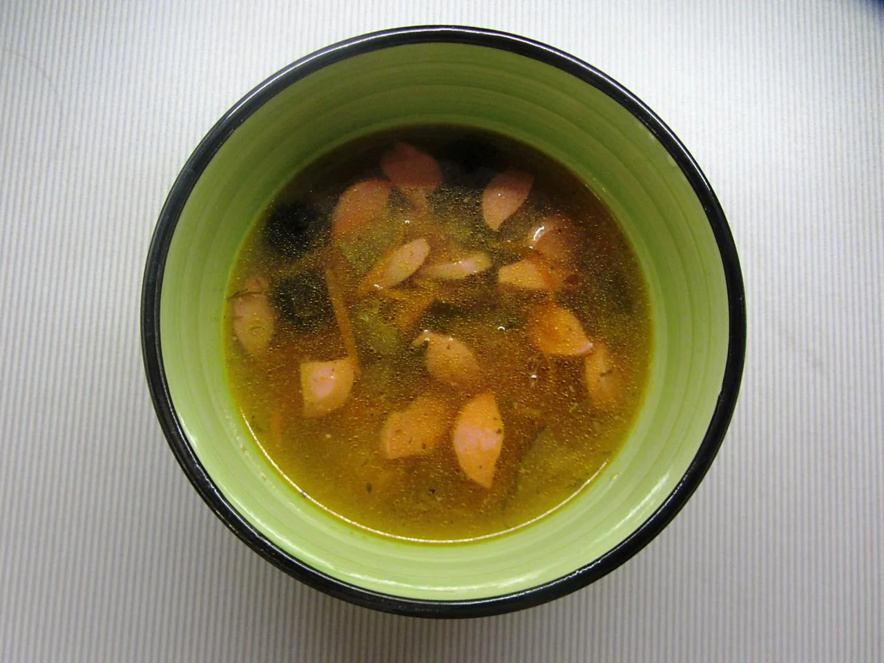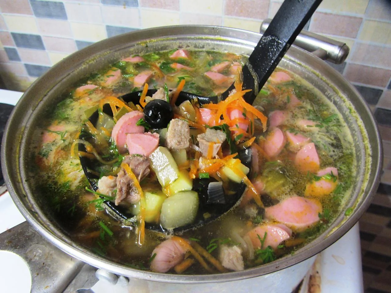 ШАГ 2 В кастрюлю (приблизительно 3 литра) положить нарезанный кубиками картофель, сосиски кружочками, мясную нарезку мелкими кубиками — копчености (все, что есть в холодильнике: колбаса п/к, колбаса т/к, карбонат и т.д.). Здесь все зависит от вашей фантазии и наличия продуктов в холодильнике.
