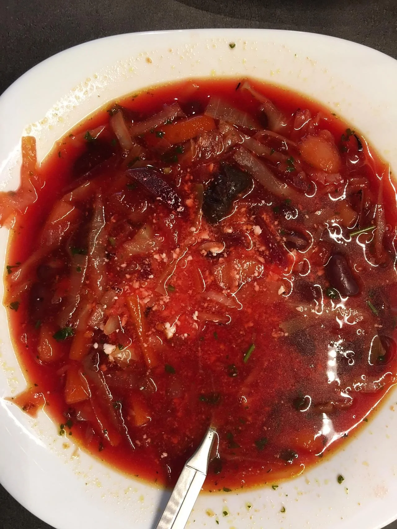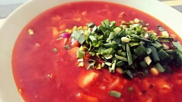 ШАГ 5 Мелко нарубить листья петрушки, раздавить чеснок и вмешать зелень и чеснок в борщ. Снять с огня и подавать со сметаной. Или мягким козьим сыром.