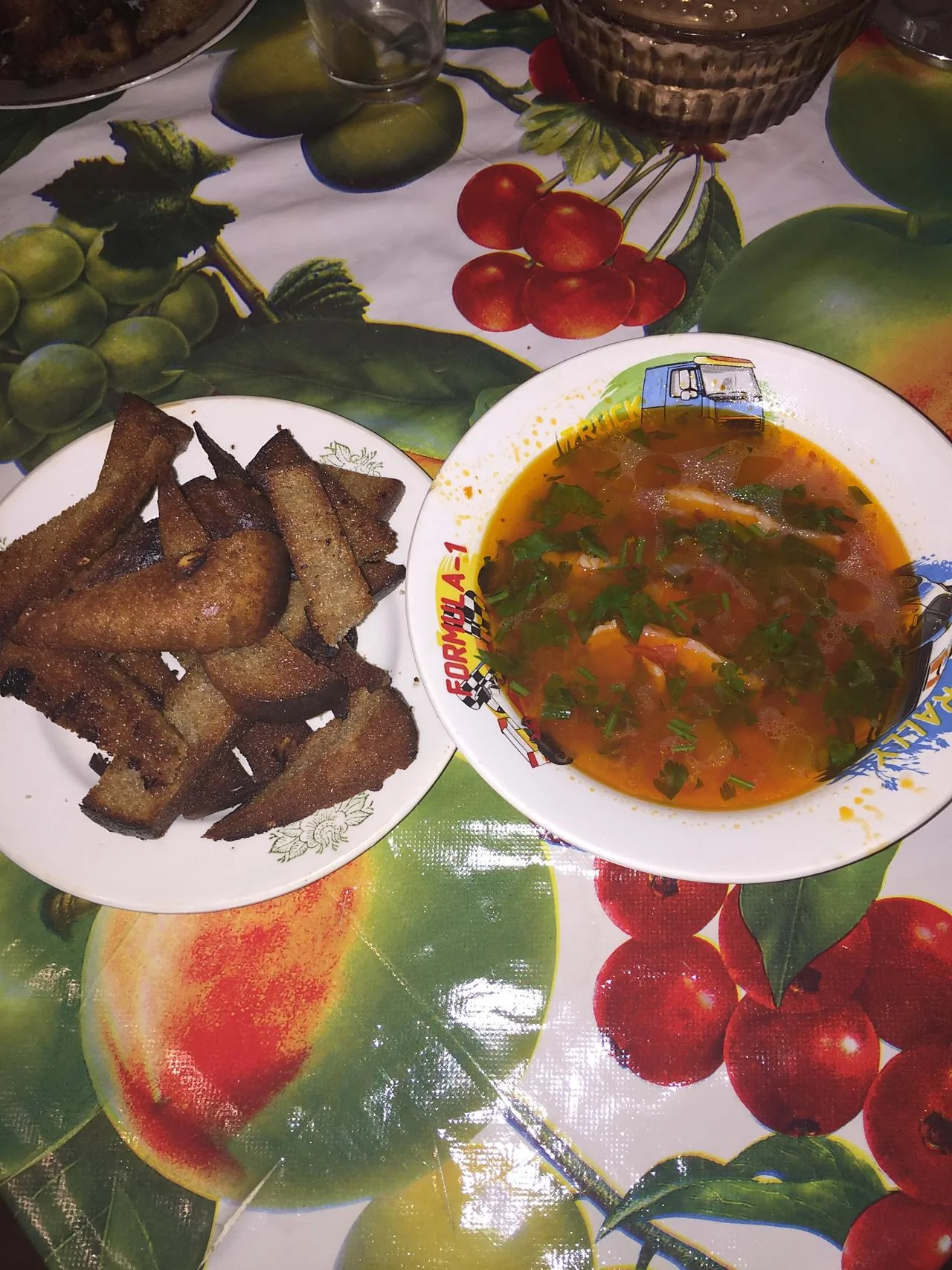 ШАГ 5 На сковороду наливаем немного растительного масла, выкладываем хлеб и чеснок, обжариваем до состояния гренок.