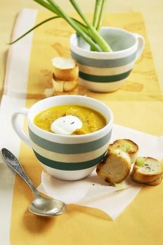 ШАГ 4 Ручным блендером взбейте суп до состояния пюре, затем вмешайте сливки. Проверьте количество соль и подавайте, посыпав крутонами.