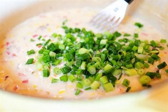ШАГ 5 Влейте смесь сливок и молока (можно использовать просто молоко). Оставьте на 10–15 минут на медленном огне. Добавьте мелко нарезанный лук.