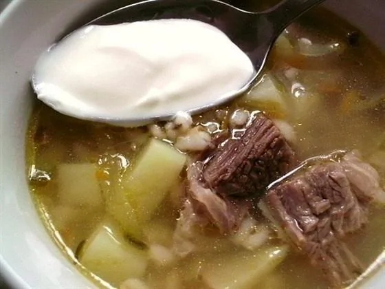 ШАГ 4 Перед подачей наливают в рассольник, вскипяченный процеженный огуречный рассол, растертую с желтками сметану, досаливают и дают закипеть.