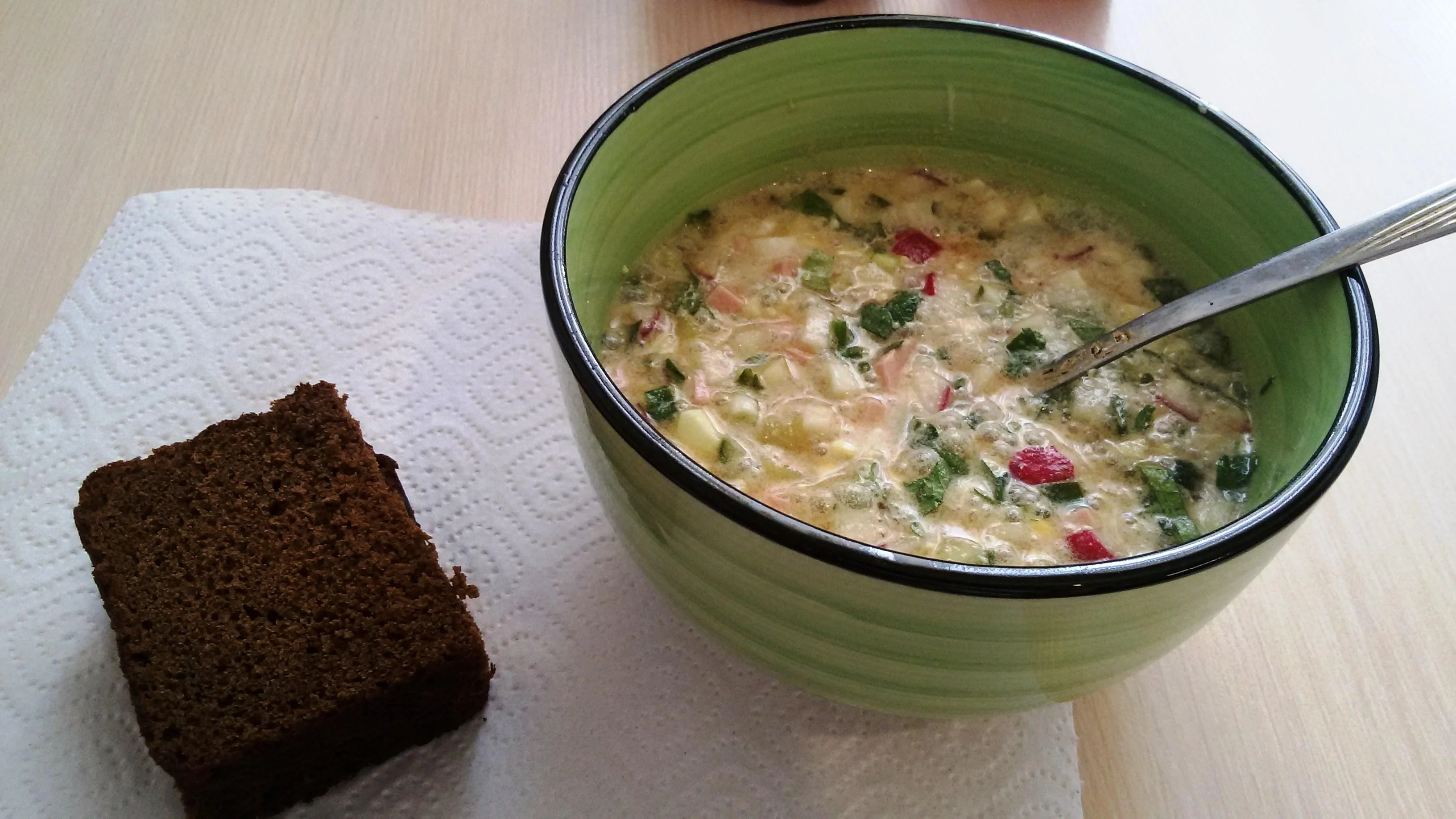 ШАГ 4 Залейте водой и квасом, добавьте сметану.