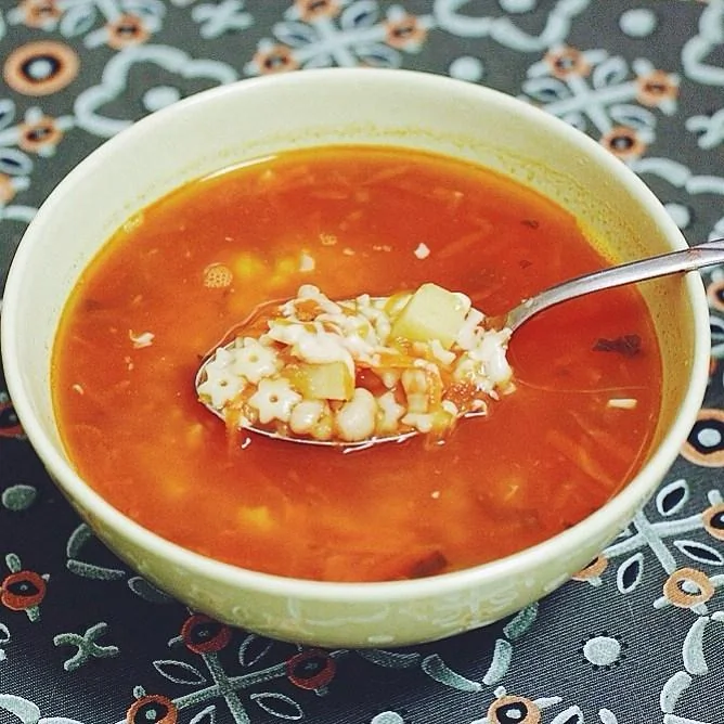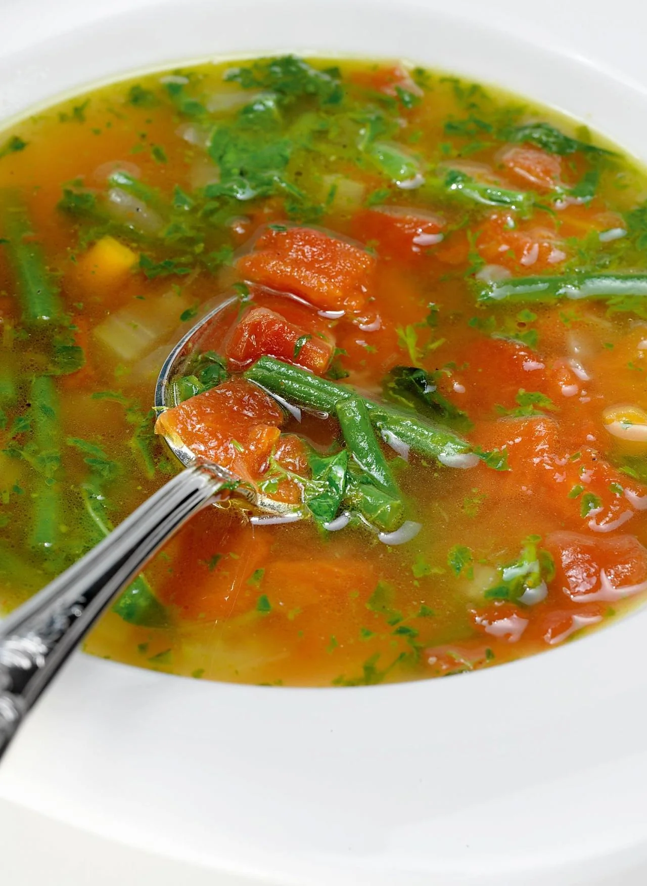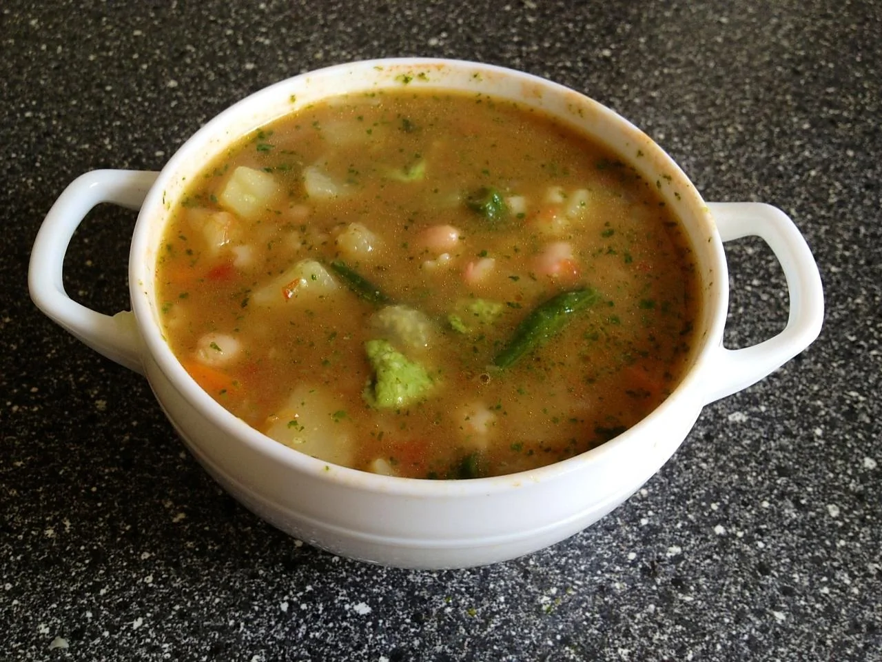 Лук репчатый Перец черный молотый Соль Чеснок Картофель Лавровый лист Оливковое масло Зеленый базилик Сыр пармезан Тонкая вермишель Сельдерей Морковь Куриный бульон Консервированные помидоры Белая консервированная фасоль Зеленая стручкова