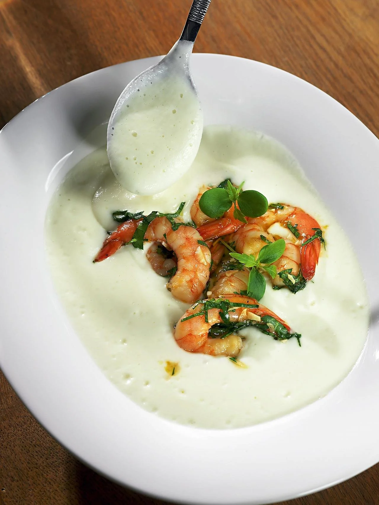 ШАГ 3 Разлить по тарелкам суп-пюре, сверху выложить маринованные креветки.
