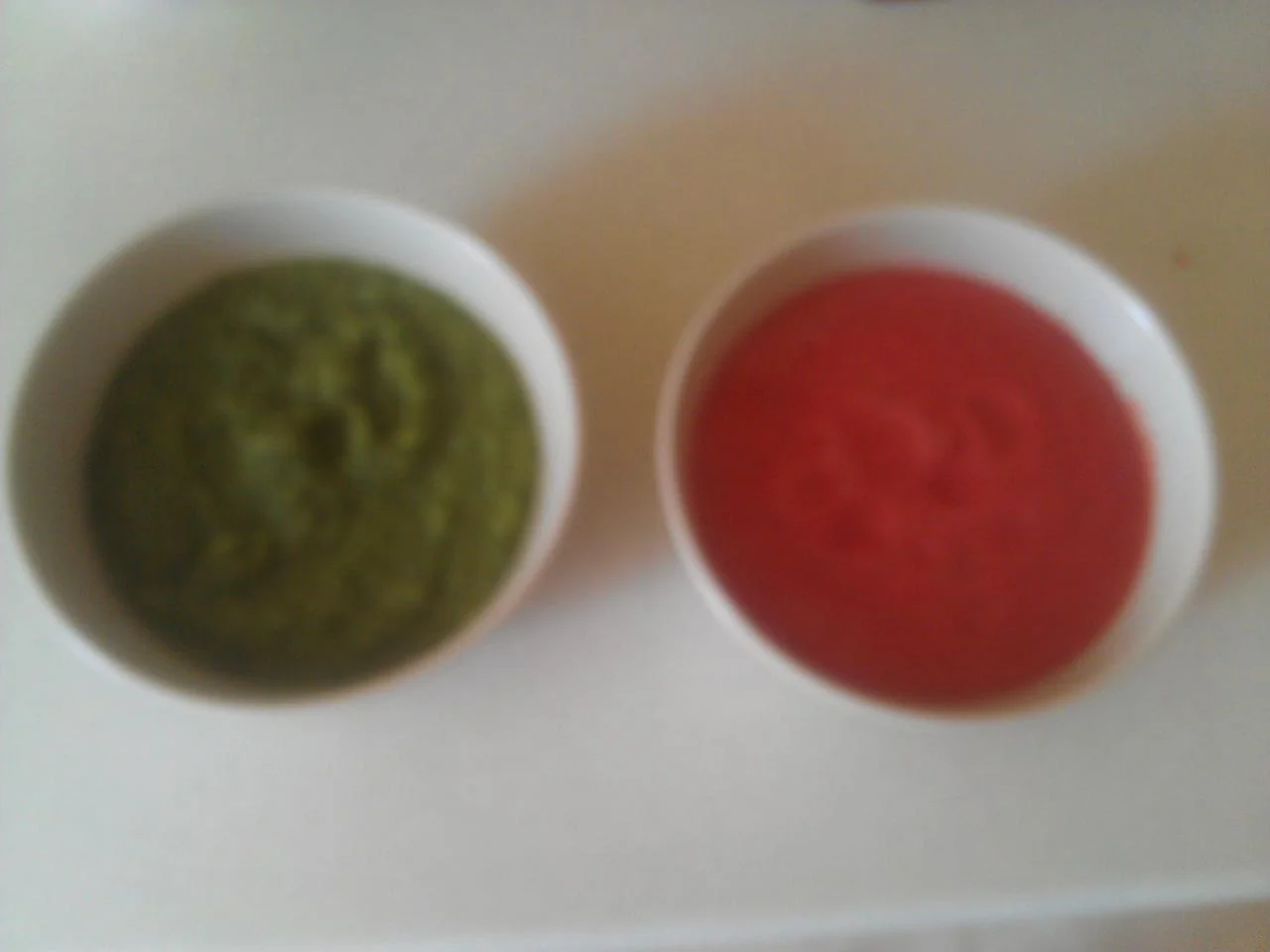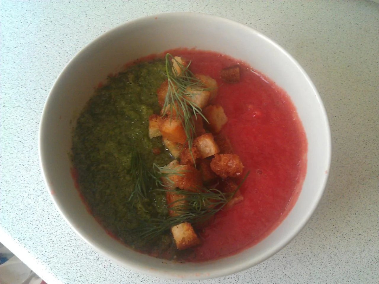 ШАГ 4 Подавать в пиале, добавив поочередно томатную и огуречную массу, сверху украсить зеленью и гренками.