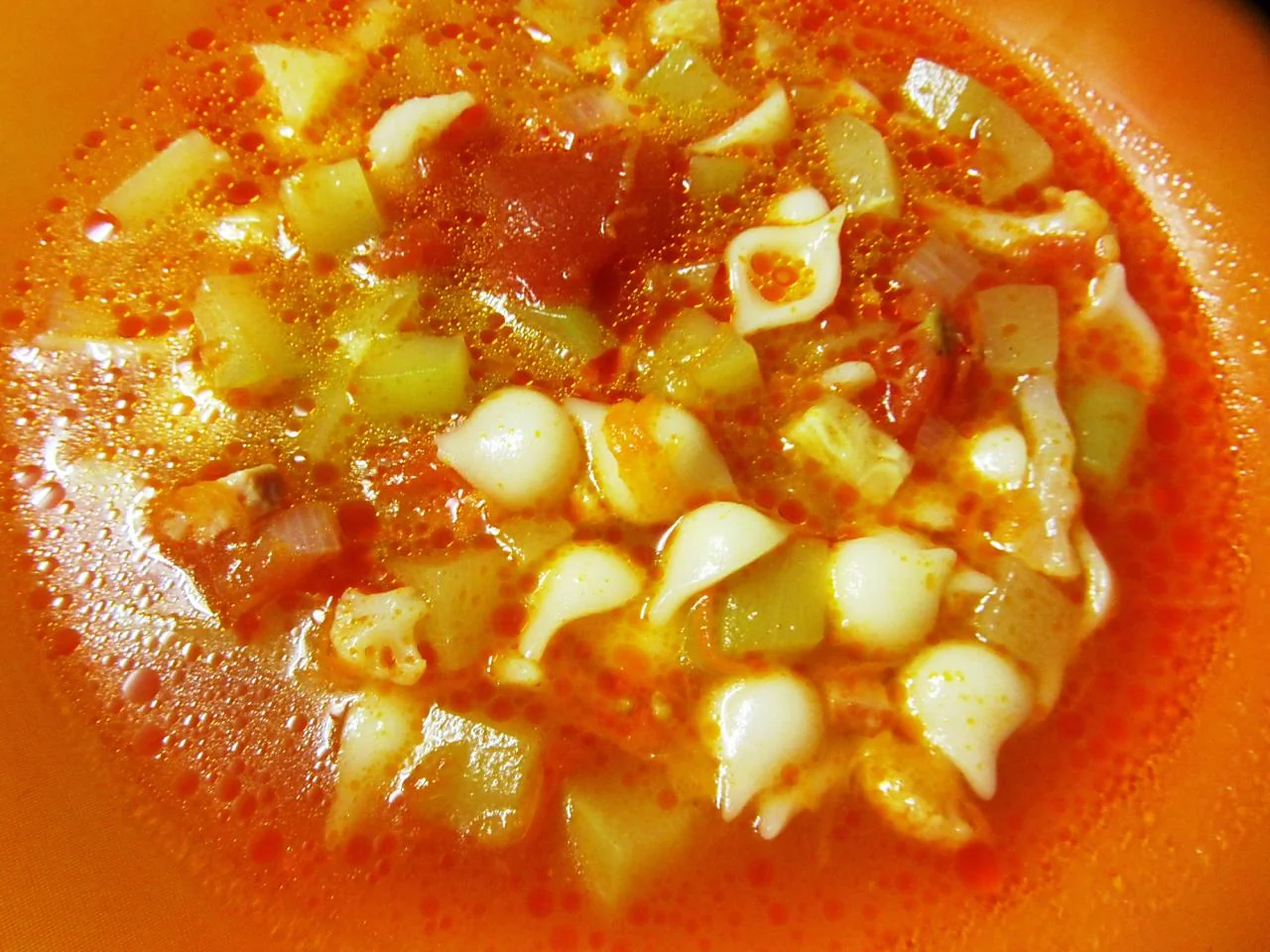 ШАГ 2 Добавляем размятые томаты вместе с соком и 700 мл воды. Доводим до кипения, добавляем макароны и варим около 5 минут. Пока варятся макароны, нарезаем кубиками кабачки. Капусту разделяем на небольшие соцветия.