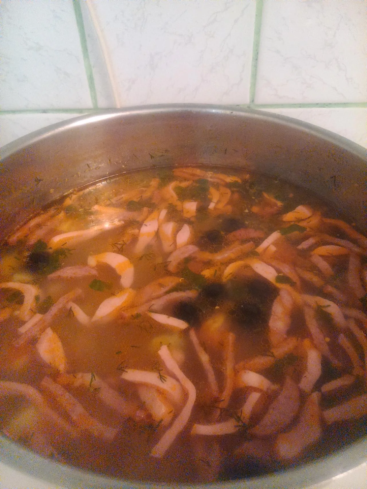 ШАГ 3 В кипящий бульон добавить картофель и специи, варить 10 минут, затем добавить обжаренные овощи, колбасу, варить на слабом огне до готовности.
