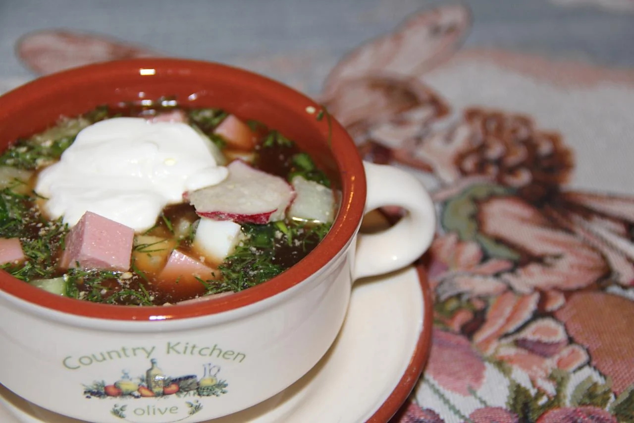ШАГ 4 Залить квасом, посыпать зеленью. Подавать охлажденной со сметаной.