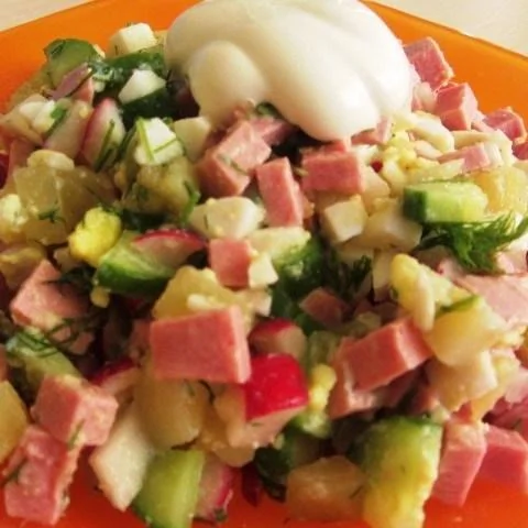 ШАГ 3 Смешать картофель, колбасу, яйца, редис, огурцы. Посолить, поперчить. Выложить в тарелки.