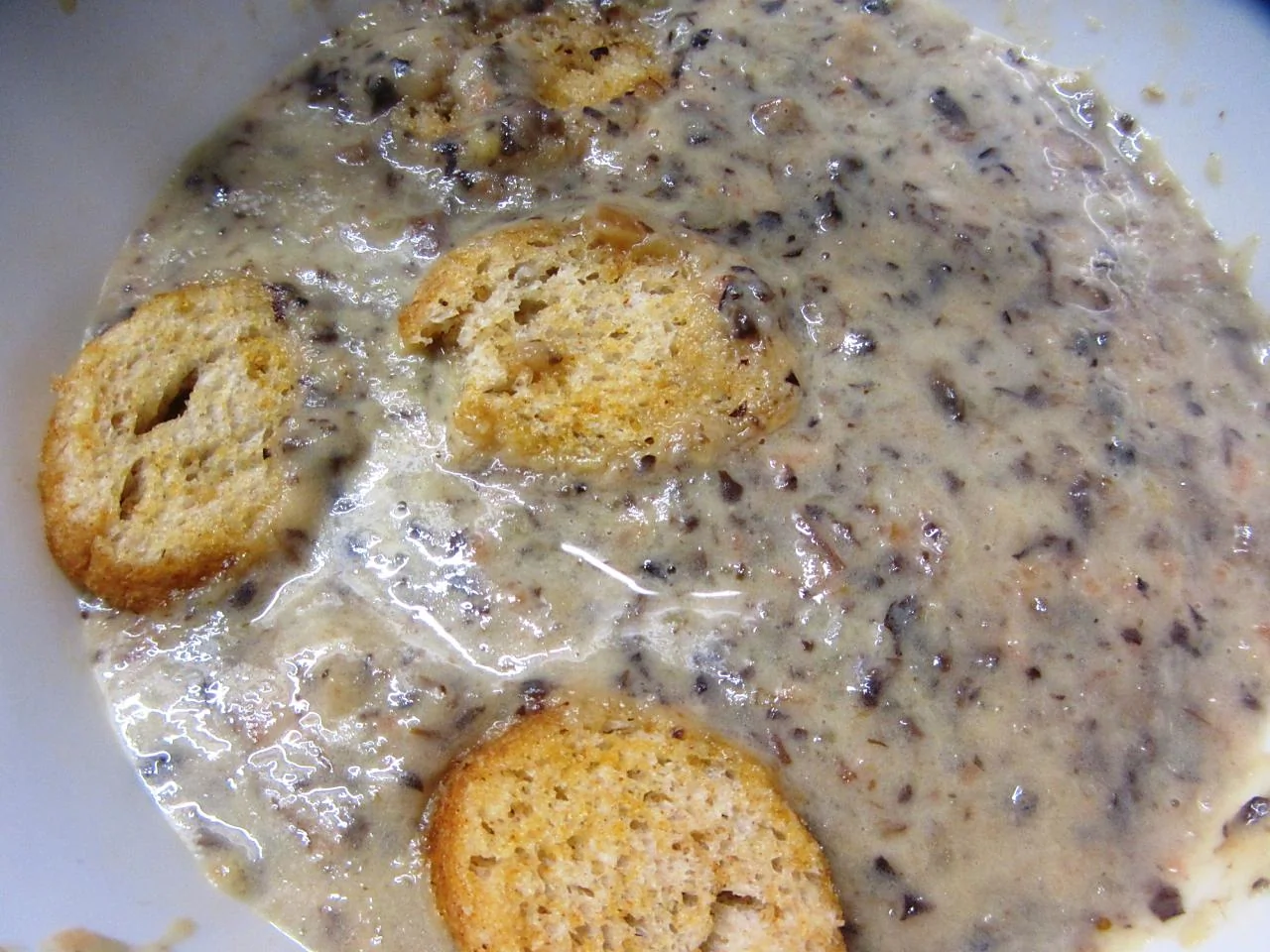 ШАГ 7 Разложить на тарелки, добавить сухарики и зелень по вкусу.