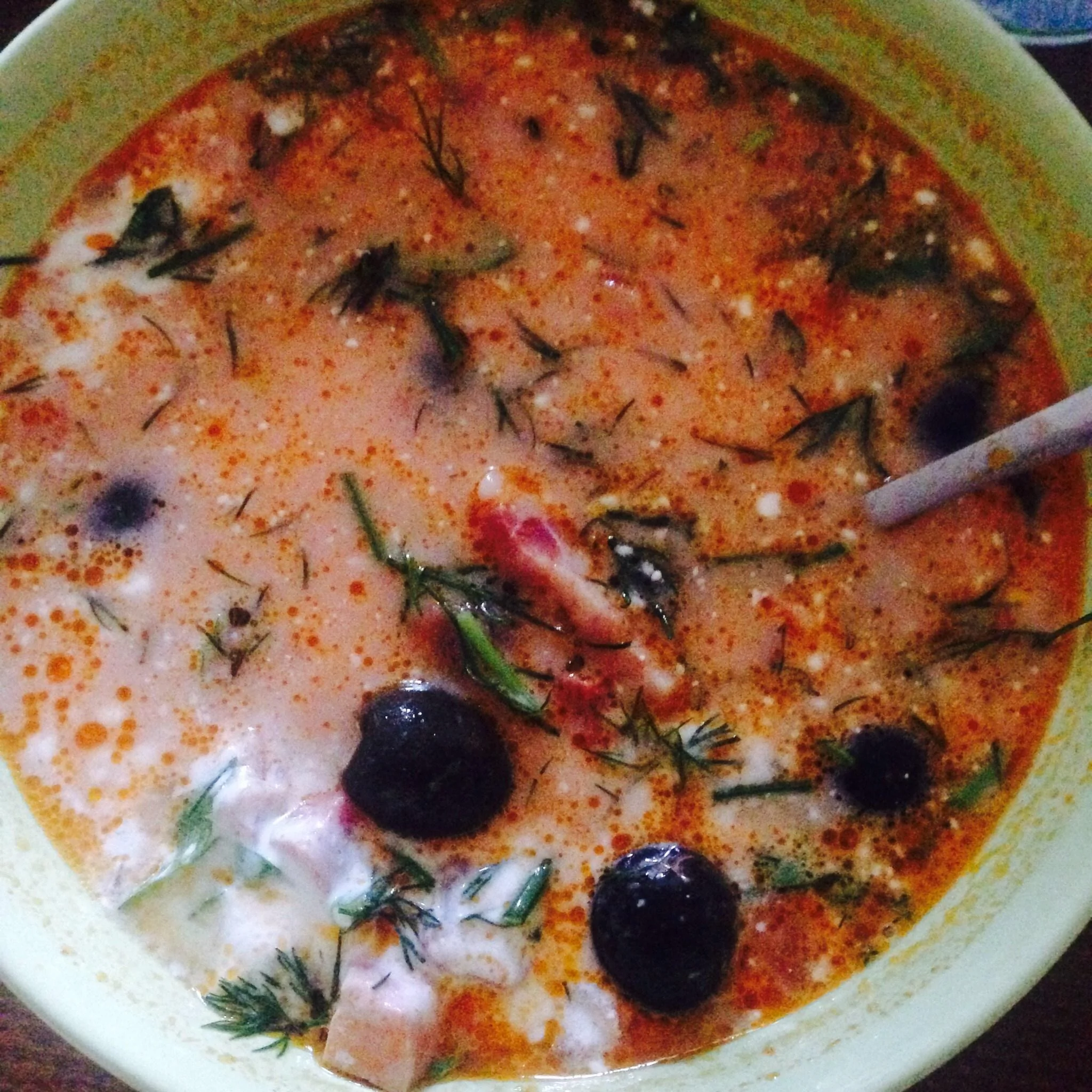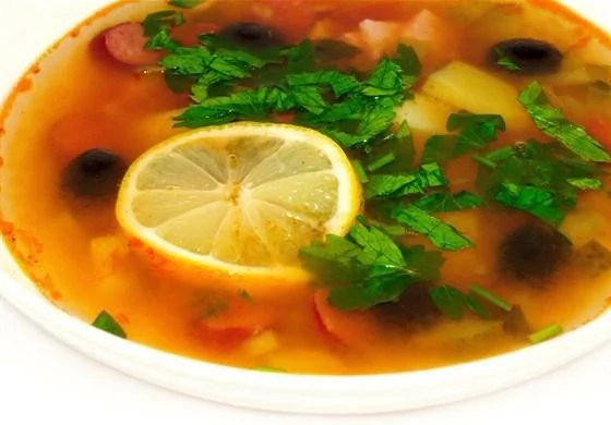 Говядина Сосиски Вареная колбаса Соленые огурцы Ветчина Лук репчатый Петрушка Маслины Томатная паста Супы Русская кухня Солянка Сборная солянка