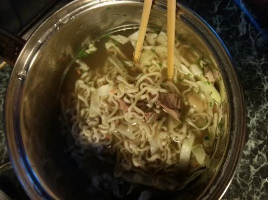 ШАГ 4 Перед подачей лапшу разогреть в кипятке. Положить в посуду, затем положить салат из редьки и салат из капусты, тушеное мясо и сверху нашинкованный яичный блинчик. Все это залить горячим бульоном.