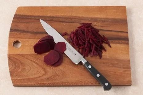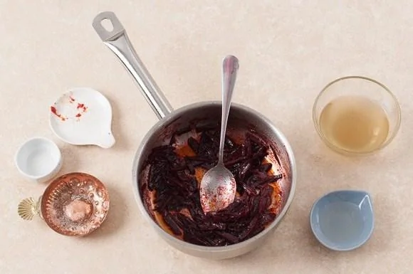 ШАГ 1 Помойте и очистите свеклу, нарежьте ее тонкой соломкой, добавьте томатную пасту, сахар и обжарьте на подсолнечном масле на умеренном огне в течение 5 минут.