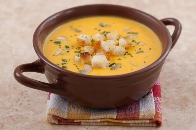 ШАГ 7 Декорируйте суп жаренными тыквенными семечками, зеленью рубленной петрушки и гренками и подавайте.
