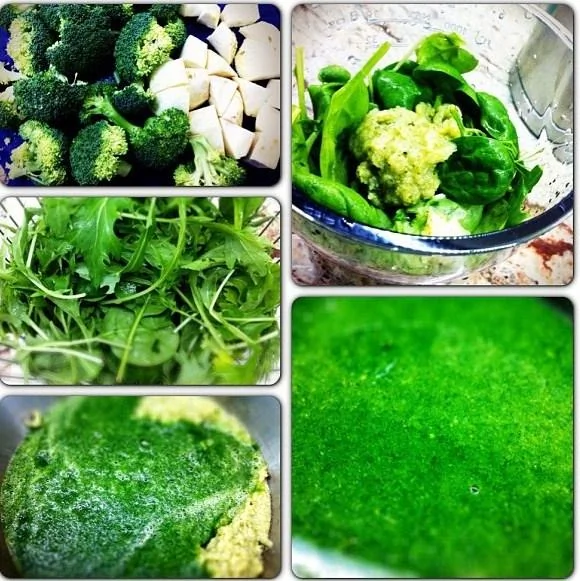 ШАГ 3 Смешать и пюрировать в блендере брокколи, корень сельдерея, шпинат, рукколу и мизуну, влить немного бульона, чтобы было проще взбивать.