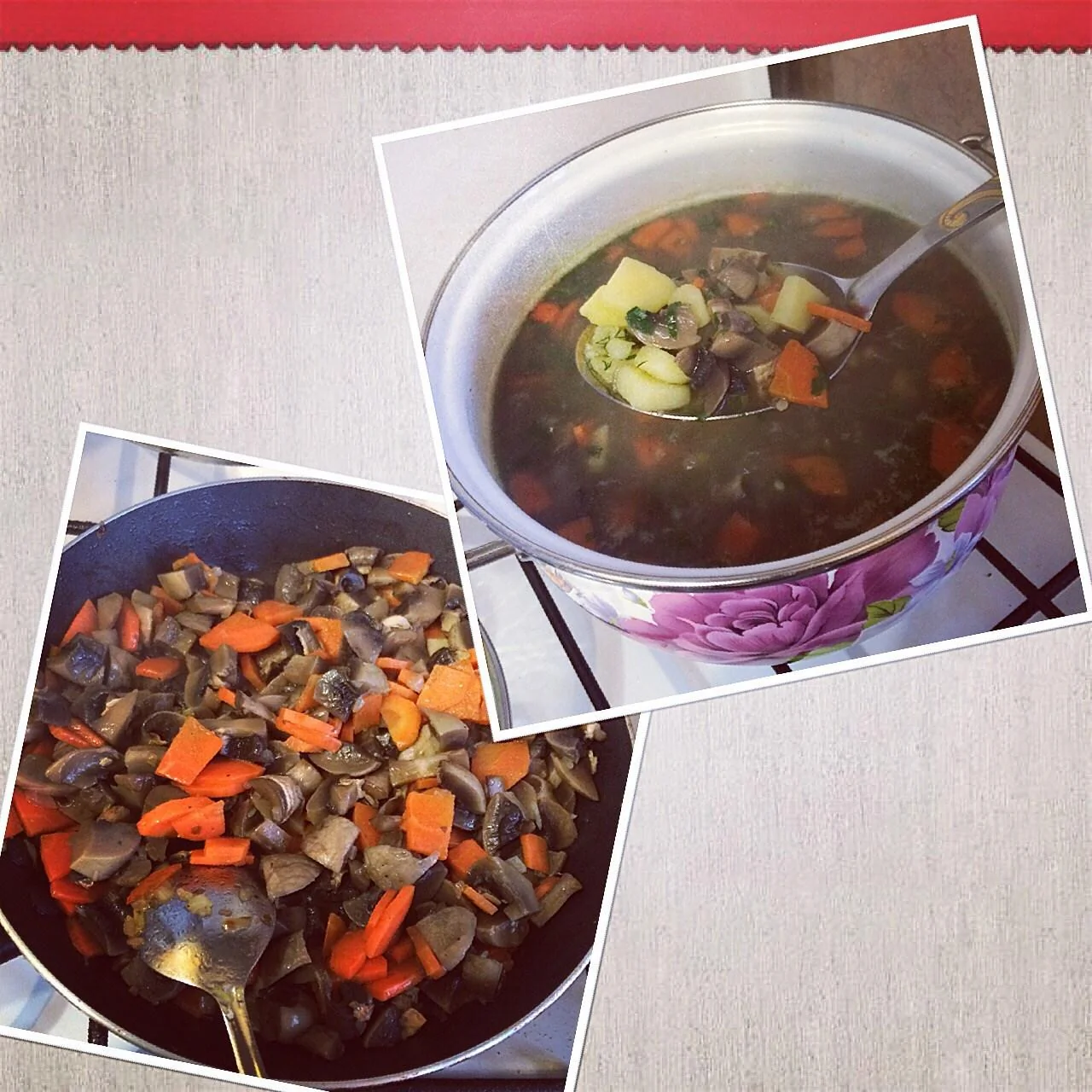 ШАГ 4 Когда грибы сварятся, вытащить их из кастрюли и нарезать на квадратики (или как вам хочется). Опустить в кастрюлю картофель, а грибы добавить к овощам, и обжарить все вместе до подрумянивания грибов (10–15 минут).