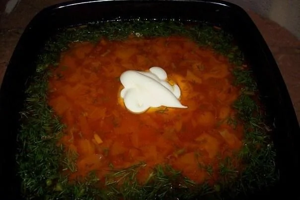 ШАГ 6 Борщ будем подавать со сметаной, посыпав зеленью.
