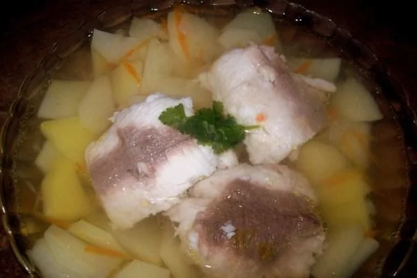 ШАГ 6 Когда картофель на половину готов, добавить кусочки пеленгаса, лук и морковь.