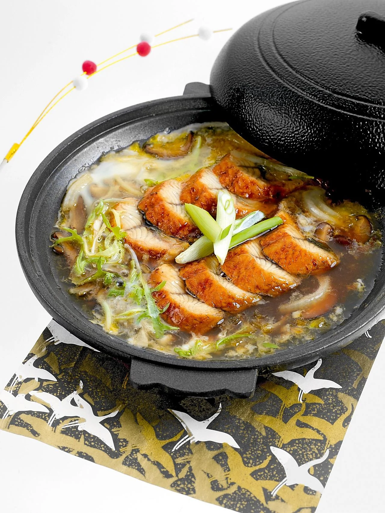 ШАГ 3 Зеленый лук и грибы шиитаке нарезать крупной соломкой, выложить на холодную небольшую сковородку, сверху разместить нарезанного ломтиками угря, залить соусом, довести до кипения, выключить огонь и немедленно влить яйцо, смешанное с салатом.