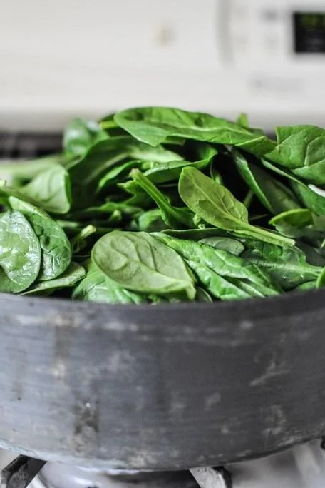 ШАГ 3 Снять с огня, дать немного остыть, добавить шпинат и другую зелень.