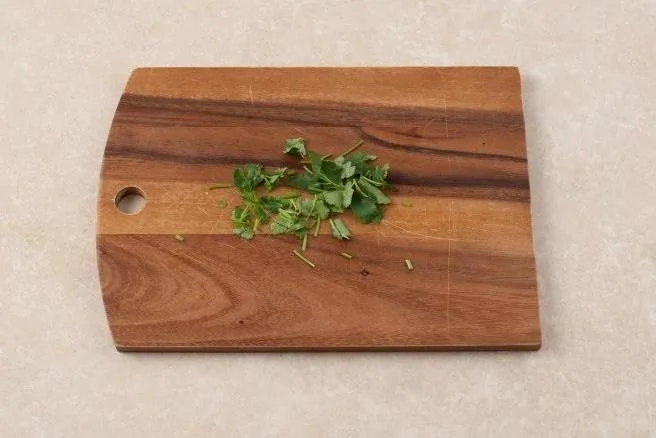 ШАГ 2 Раздавите, очистите и мелко нарубите 0,5 чеснока, отрежьте 2 тонкие пластины чили перца.