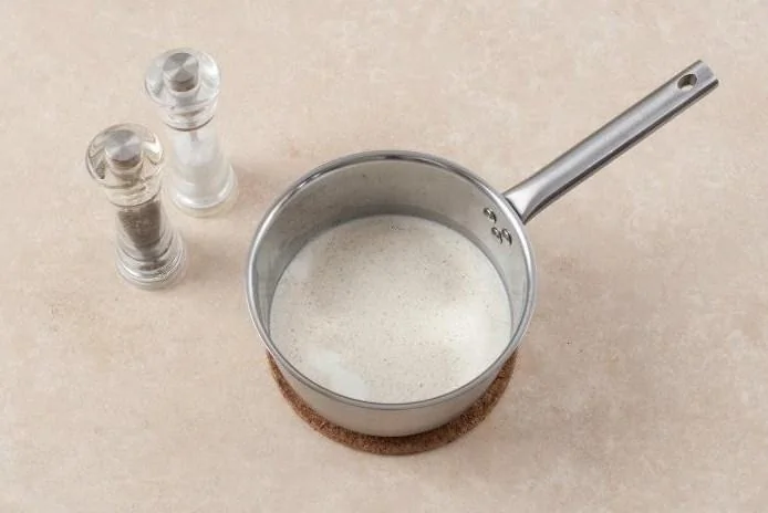 ШАГ 1 В сотейник залейте молоко и 100 мл воды, посолите, попречите, доведите до кипения.