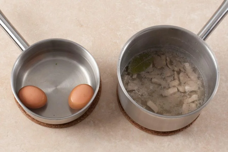 ШАГ 1 Отварите яйца вкрутую в кипящей воде в течение 10 минут, охладите в проточной воде; нарежьте куриную грудку мелким кубиком и отварите ее в кипящей воде с лавровым листом, солью и перцем в течение 3-х минут, снимите с огня.