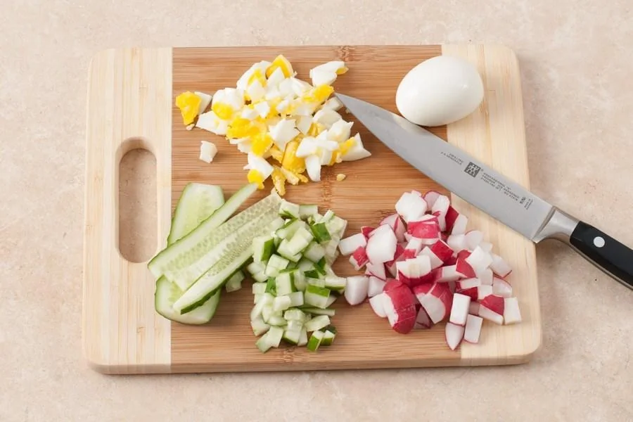 ШАГ 2 Яйцо, редис и огурец нарежьте мелким кубиком.