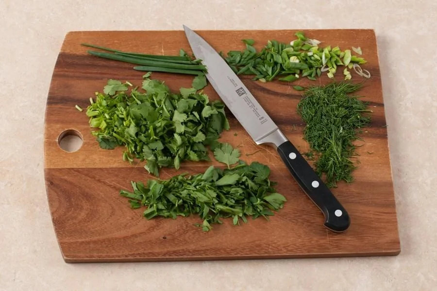 ШАГ 3 Отложите 2 макушки укропа для украшения; мелко нарубите лук, кинзу, петрушку и оставшийся укроп.
