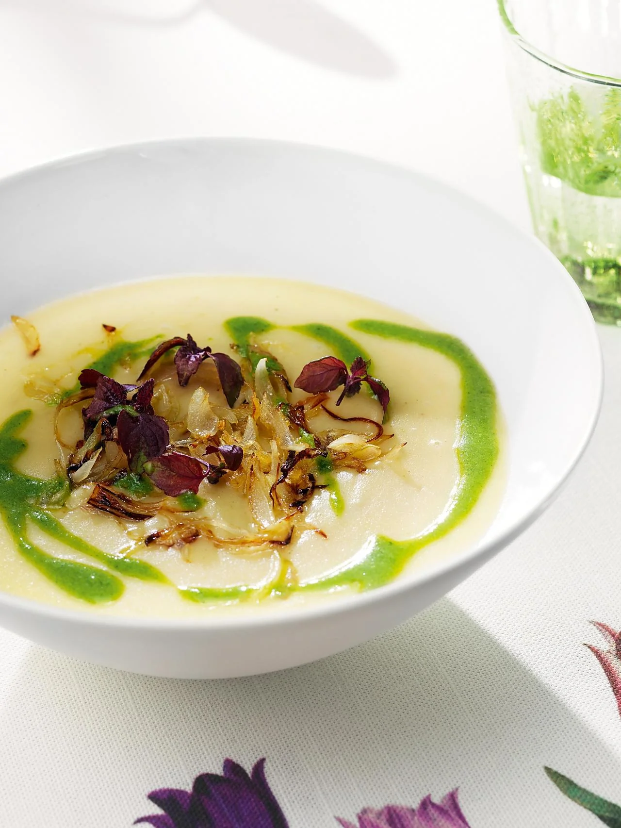 ШАГ 5 Превратить суп в густое пюре. Подавать, приправив луковыми чипсами и песто.