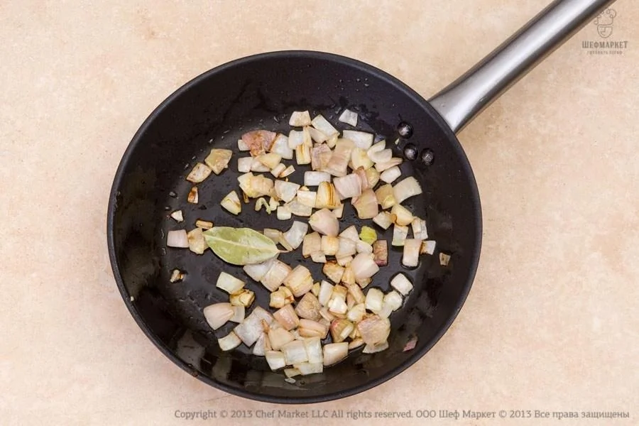 ШАГ 2 Параллельно нарежьте крупно лук и обжарьте с лавровым листом на оливковом масле на умеренном огне в течение 3-х минут до размягчения, добавьте в суп и варите еще 1 минуту.