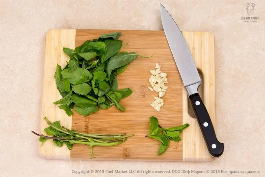 ШАГ 3 Отложите 2 макушки мяты на украшение; отделите листья базилика и мяты от веток, мелко нарубите чеснок.