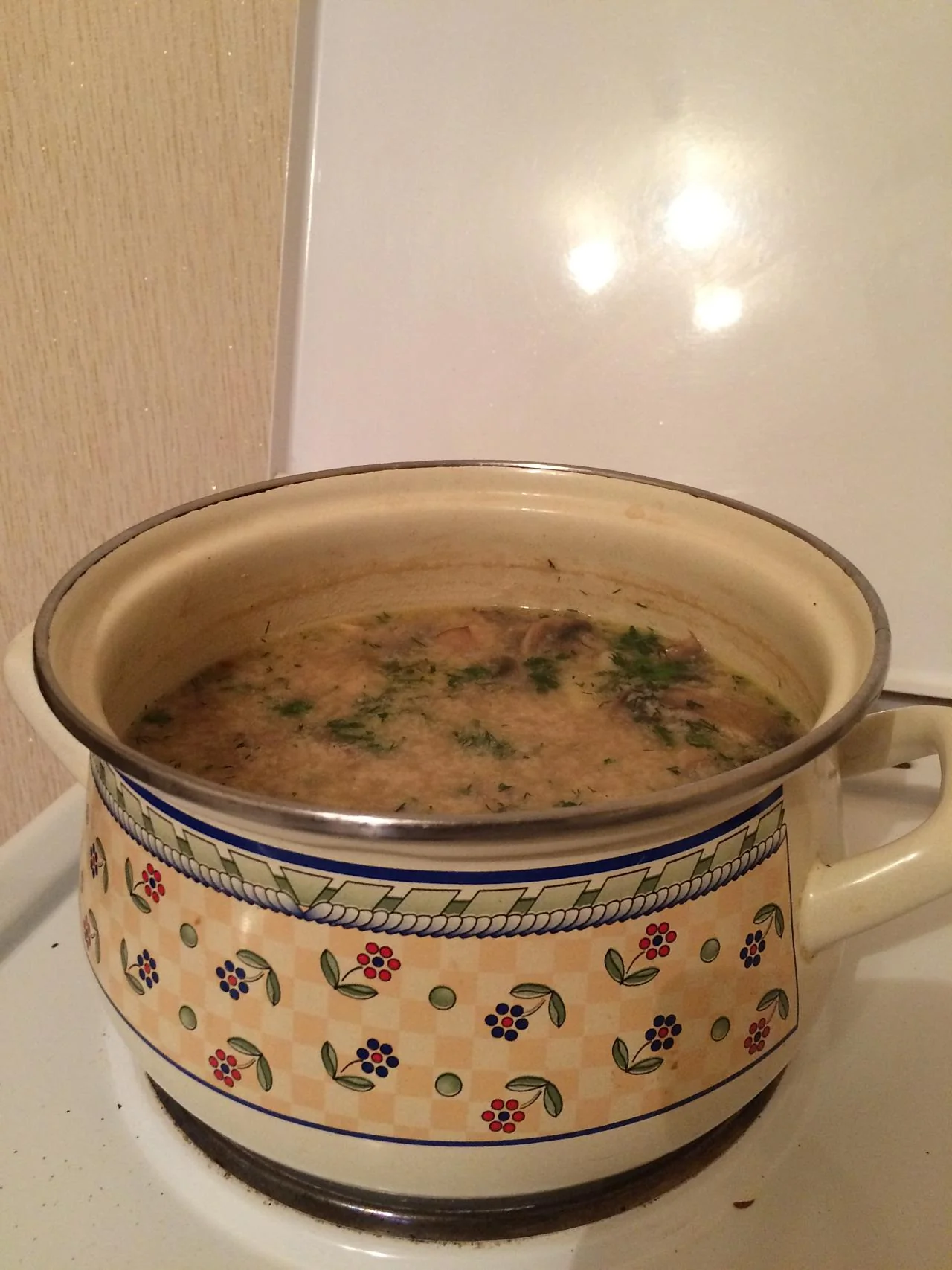 ШАГ 4 Бульон довести до кипения, положить картофель. Варить 10–15 минут до мягкости картофеля. Добавить в кастрюлю обжаренные грибы с луком, варить 5 минут. Добавить нарезанное куриное филе.