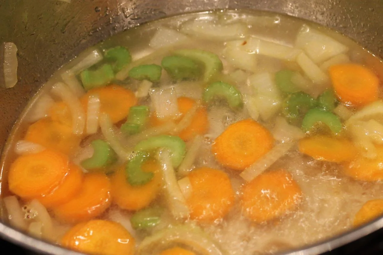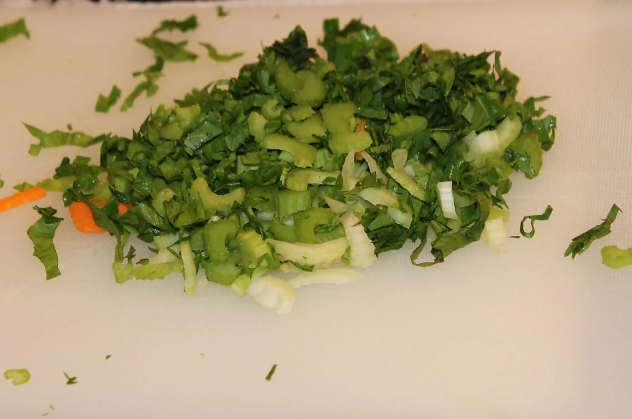 ШАГ 1 Произвольно нарезаем сельдерей, лук и морковь. Обжариваем на оливковом масле. Добавляем воды и протушиваем до готовности.