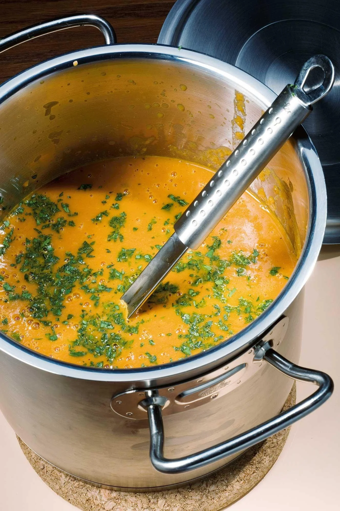 ШАГ 4 Отправить содержимое сковороды в блендер, добавить нежирных сливок и на малых скоростях, а еще лучше — в режиме пульсации — превратить густой суп в пронзительно пахнущую югом рыжую кашу.