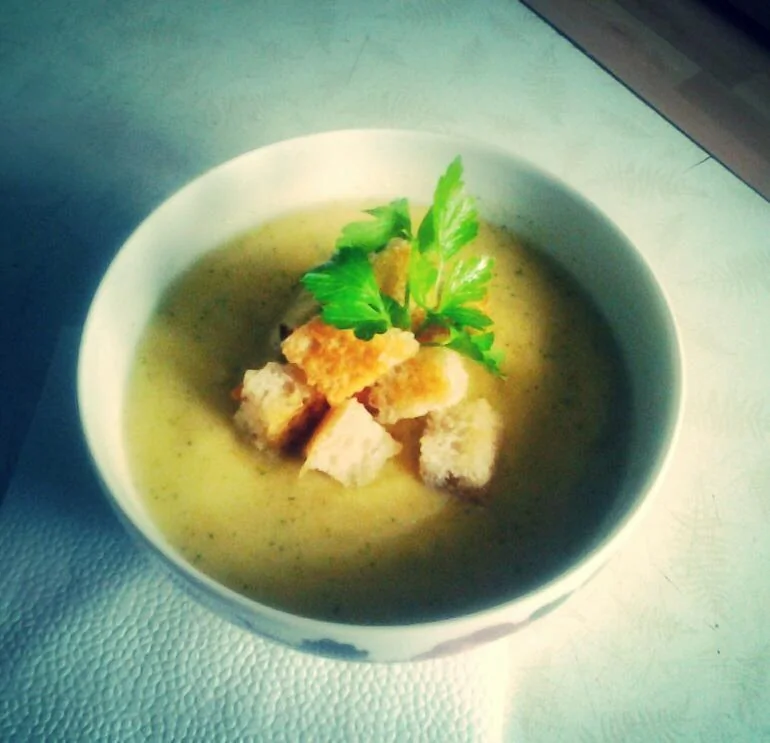ШАГ 4 Когда горох будет готов, добавляем в суп зажарку, соль, специи. Доводим до кипения, добавляем зелень и на медленном огне варим суп еще минут 5. После чего настает черед блендера. Он у меня погружной, так что я орудую им прямо в кастрюле, в которой варила суп. Если ваш блендер не погружной, суп сначала надо остудить. Измельчаем блендером до однородной, кремообразной массы.