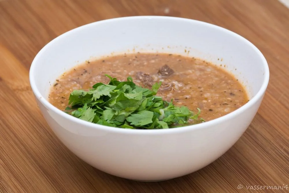 ШАГ 1 Мясо промыть и отчистить от жилок. Мякоть отделить от кости. Переложить мякоть и кость в кастрюлю, залить 2 литрами холодной воды. Туда же положить корни петрушки и кинзы, целую очищенную луковицу и перец горошком. Варить мясо два часа на слабом огне, достав через час корни зелени и луковицу.
