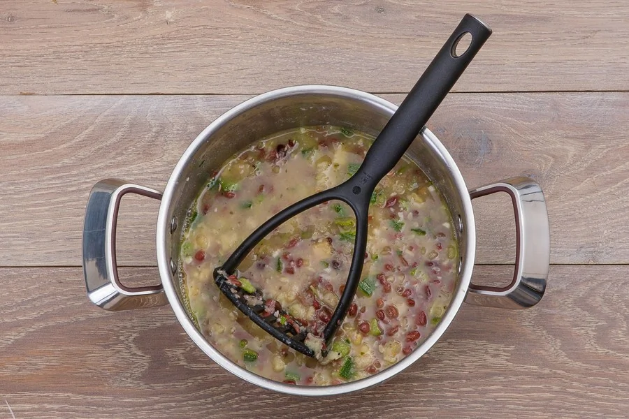 ШАГ 6 Добавьте чеснок; слегка разомните готовый суп толкушкой для картофеля, чтобы он стал более однородным (но не до состояния пюре, пусть останутся и твердые кусочки).