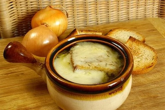 ШАГ 2 Нарежьте лук кольцами и обжарьте в сотейнике или кастрюле, туда же добавьте мелко порезанный чеснок и муку. Обжаривайте в течение нескольких минут до золотистого цвета. Влейте бульон.