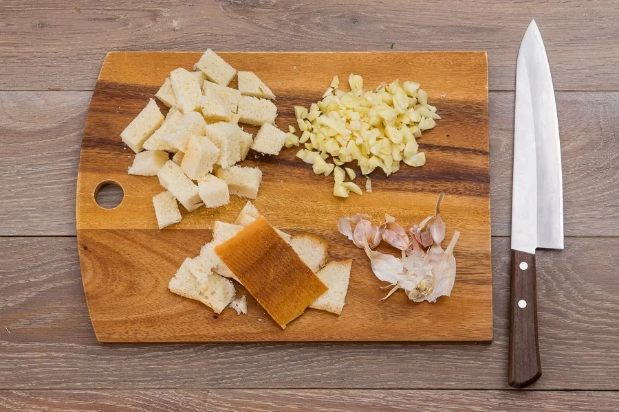 ШАГ 1 Раздавите, очистите и крупно порубите чеснок, хлеб очистите от корки и и нарежьте его крупным кубиком.