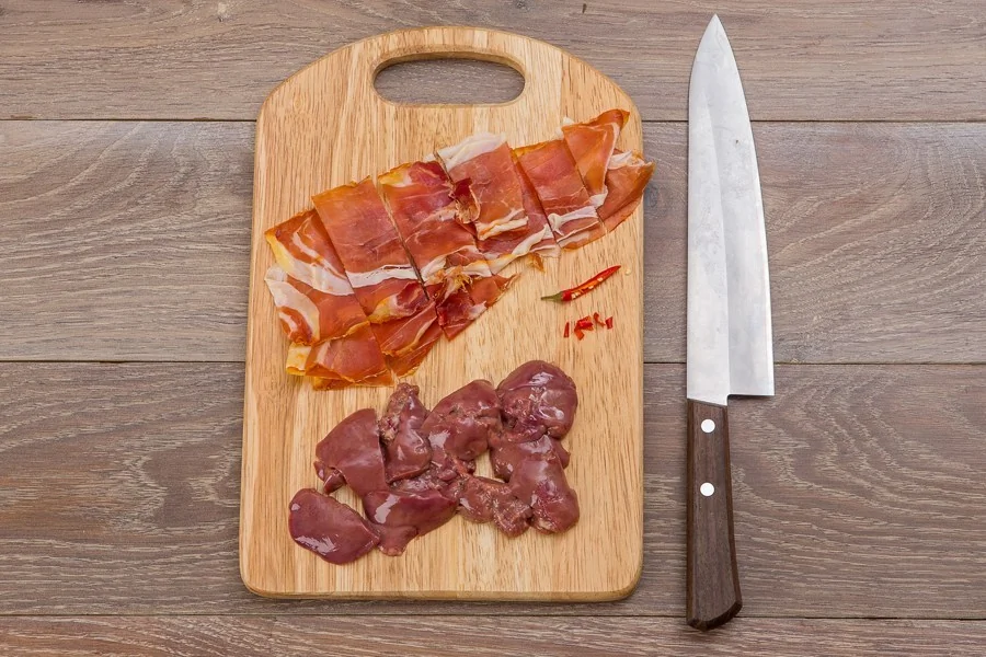 ШАГ 2 Печень нарежьте крупными кусками, крупно нарежьте хамон, чили очистите от семян и мелко нарубите 0,5 стручка.