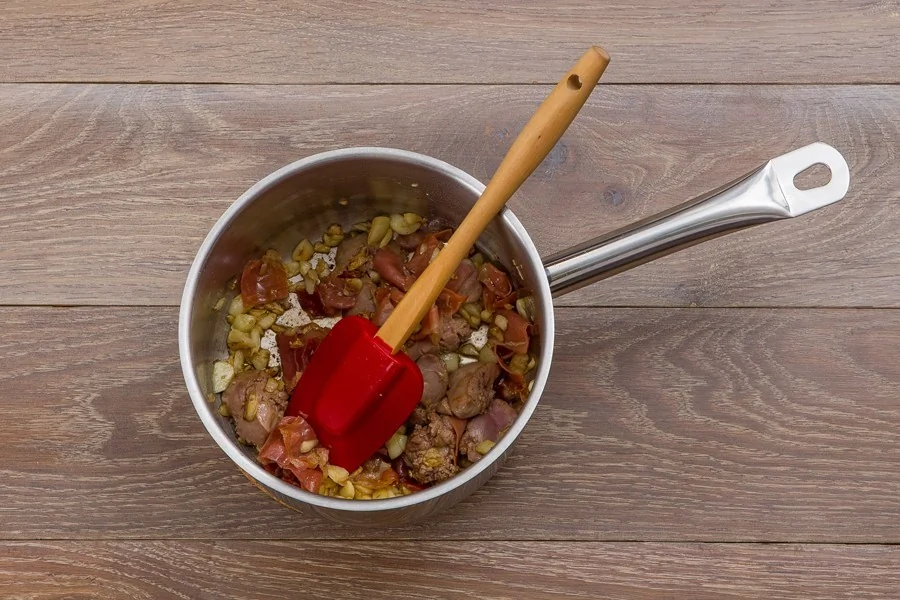 ШАГ 3 Обжарьте чеснок на оливковом масле на среднем огне в течение 30 секунд, добавьте хамон и печень и жарьте, постоянно помешивая, еще 2 минуты.