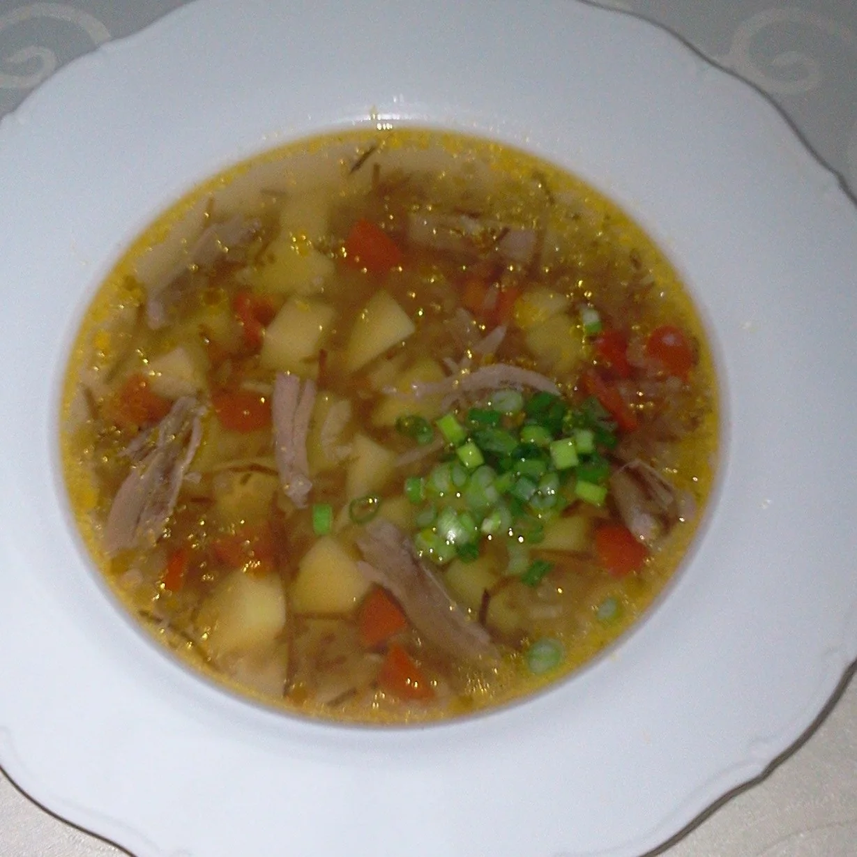 ШАГ 2 Достать мясо из бульона, отделить от кости и положить обратно.