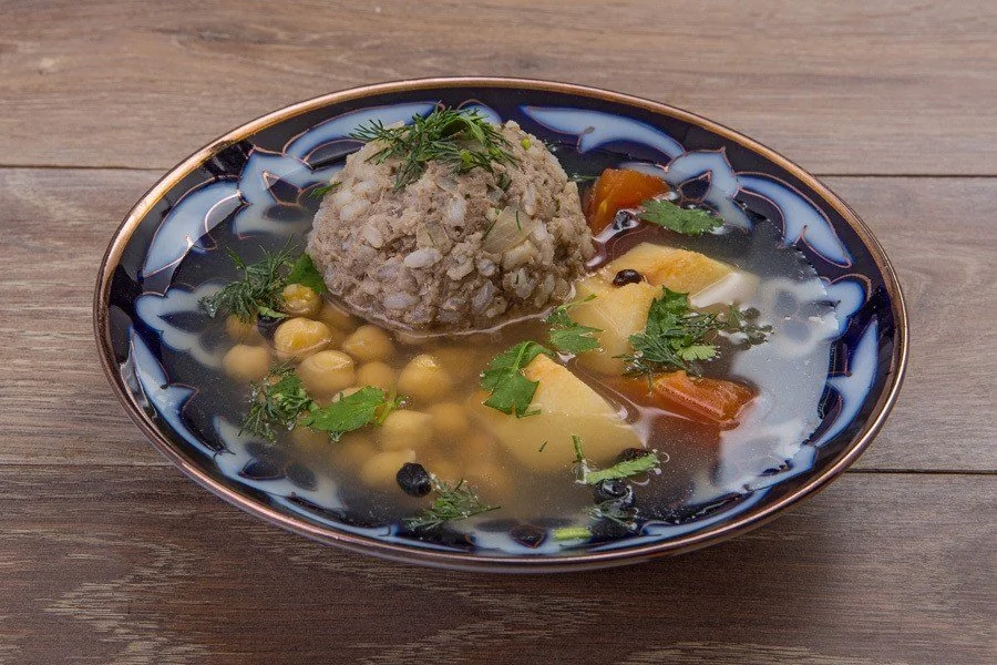 ШАГ 7 Выложите в тарелку кифту, дольки айвы, помидоры, нут, залейте бульоном, посыпьте зеленью и подавайте.