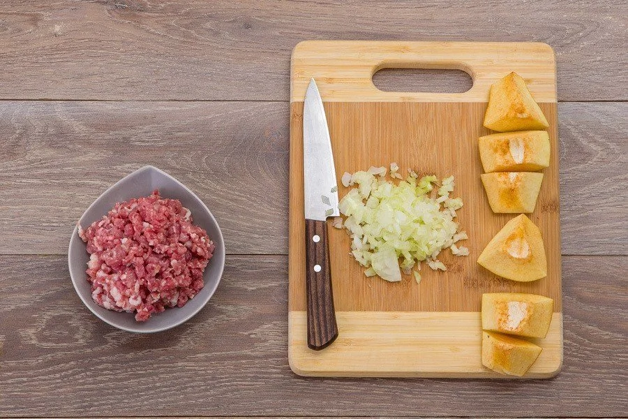 ШАГ 1 Очистите мясо от жил, пропустите мясо и курдюк через мясорубку; очистите и мелко нарежьте лук, очистите от семян айву, разрежьте на несколько крупных кусков.