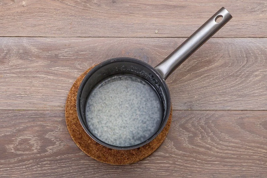 ШАГ 2 Рис отварите в кипящей воде в течении 5-ти минут, слейте воду.